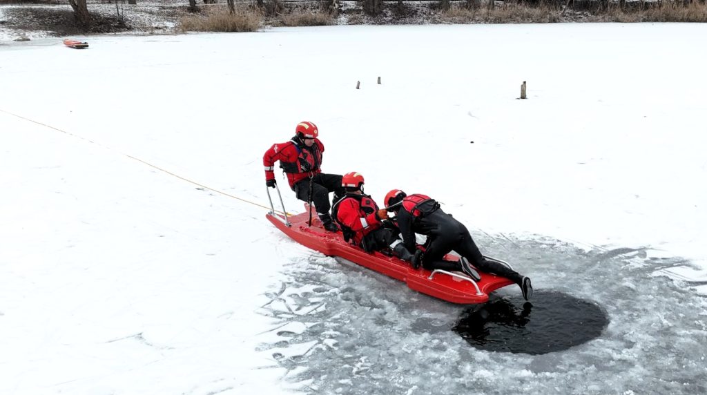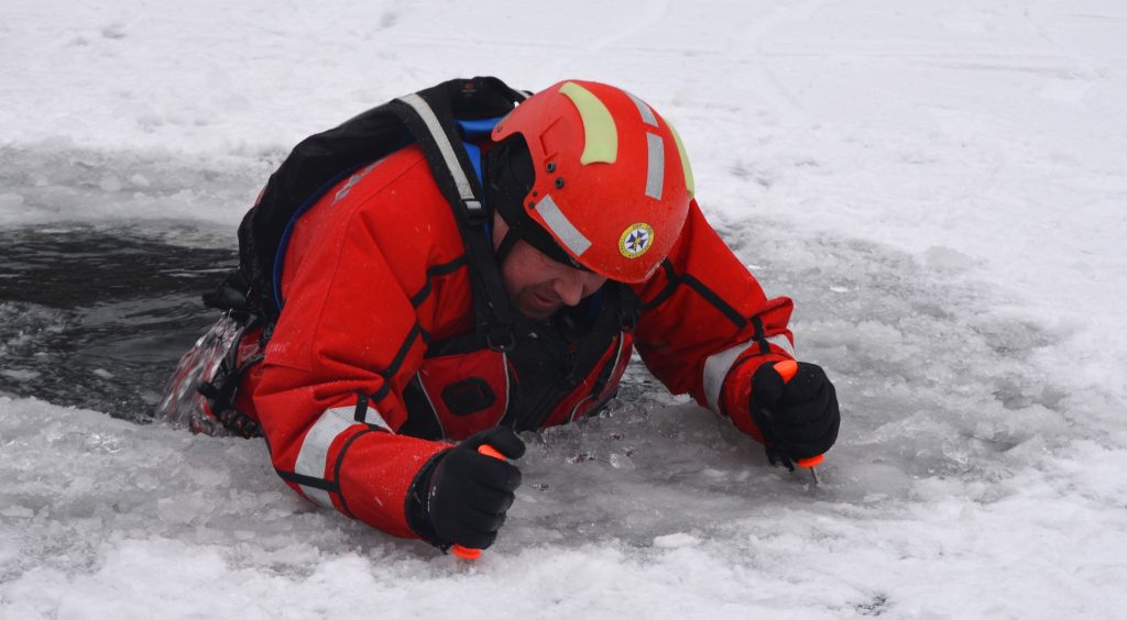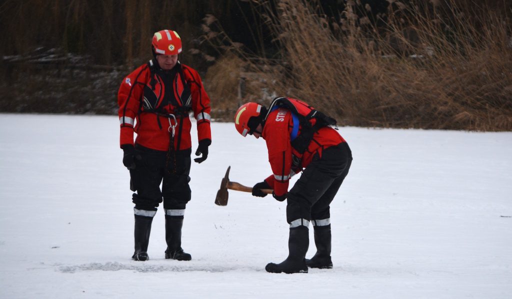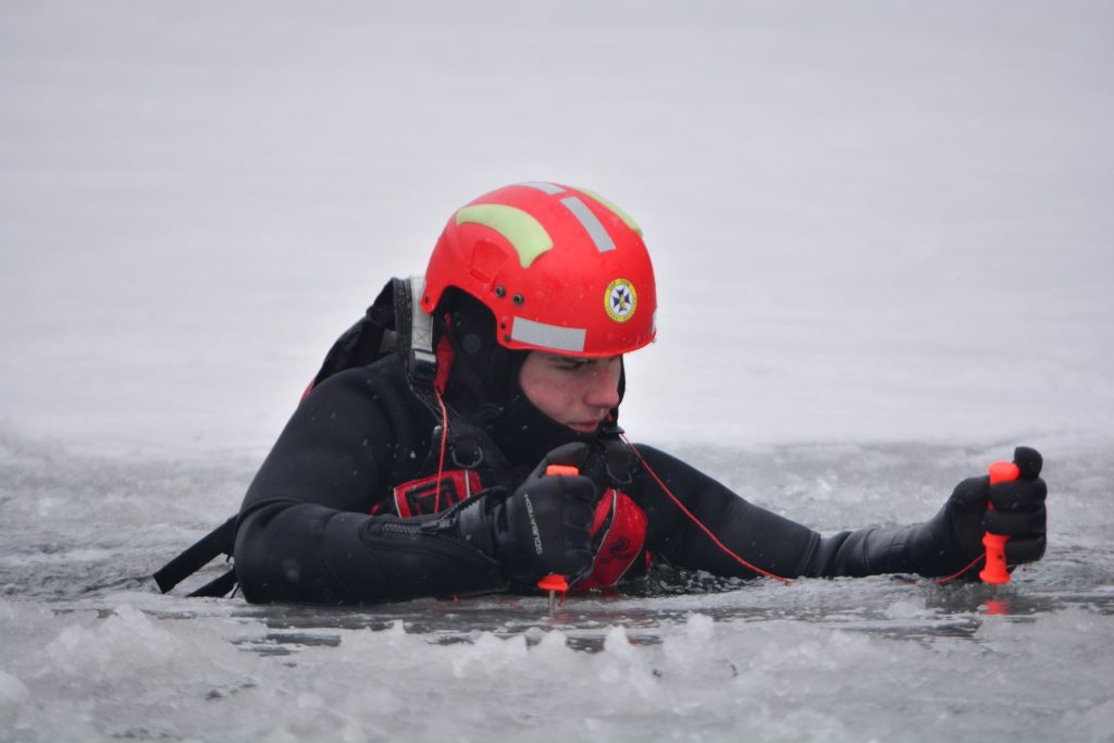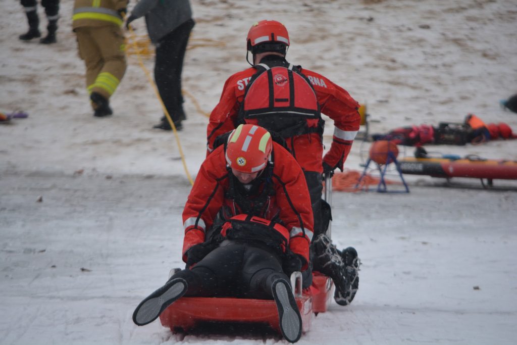 Pierwszą rzeczą jaką musieliśmy zrobić na miejscu było wykonanie przerębla, grubość lodu to około 15 cm (grubość odpowiednia do bezpiecznego poruszania się po lodzie). Po przygotowaniu miejsca ćwiczenia pierwszym elementem było samoratowanie z użyciem kolców lodowych. Następnie ćwiczyliśmy techniki ratownicze z użyciem sań lodowych.