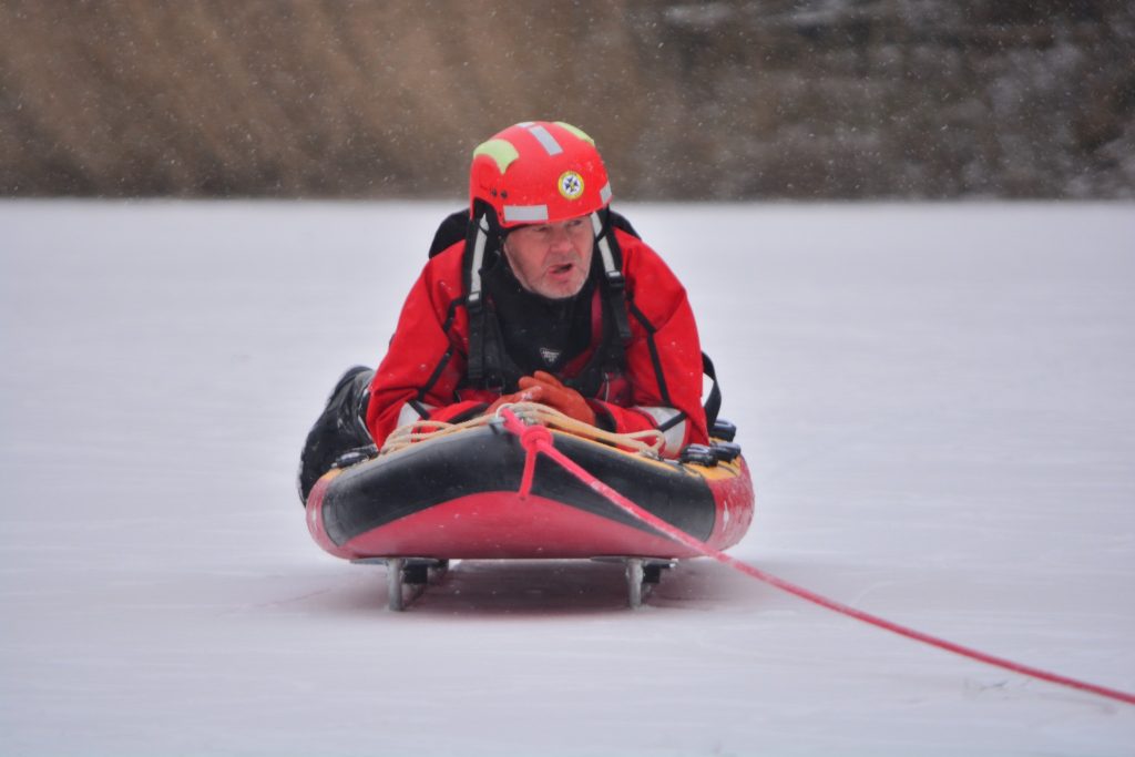 Kolejnym elementem było testowanie dostarczonej nam przez firmę Błękitna Fala blekitna.com pompowanej deski ratowniczej Rescue ICE, a zakupionej w ramach programu OC i OL. Jak najprościej opisując jest to deska sup o wzmocnionej konstrukcji dodatkowo z wieloma uchwytami i derlingami. Do dna mocowane są metalowe płozy co daje możliwości ciągnięcia jej po lodzie i śniegu. Ze względu na niską wagę może ją obsługiwać z łatwością jeden ratownik. Dziś lód był gruby, zobaczymy jak będzie się sprawować na kruchym.